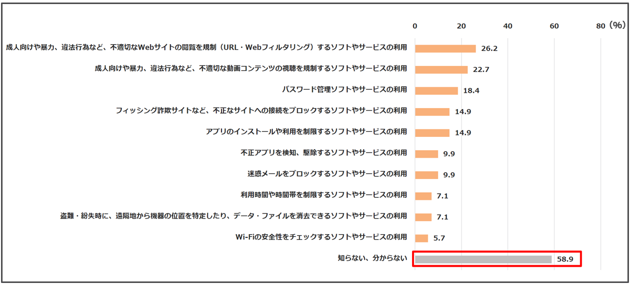 保護者の58.9%、教員の29.9%が、子どもが受け取った端末に、危険を回避するための設定やツール等の技術的対策が施されているか理解していないことが分かりました。保護者と教員は子どもが利用している端末に、どのような対策が施されているのか理解した上で子どもを教育することが大切です。